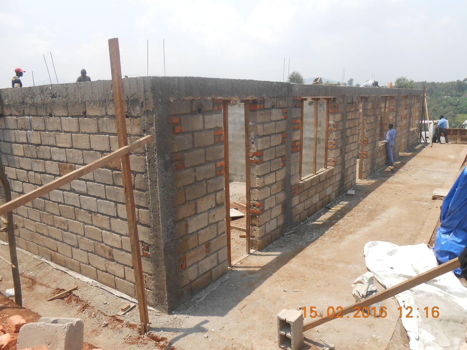 Anfang Februar 2016 sind die Hohlziegel für die Wände angeliefert worden. Die Maurerarbeiten können beginnen. Innerhalb von drei Wochen entsteht der Rohbau. Die einzige Maschine ist eine motorbetriebene Wasserpumpe.