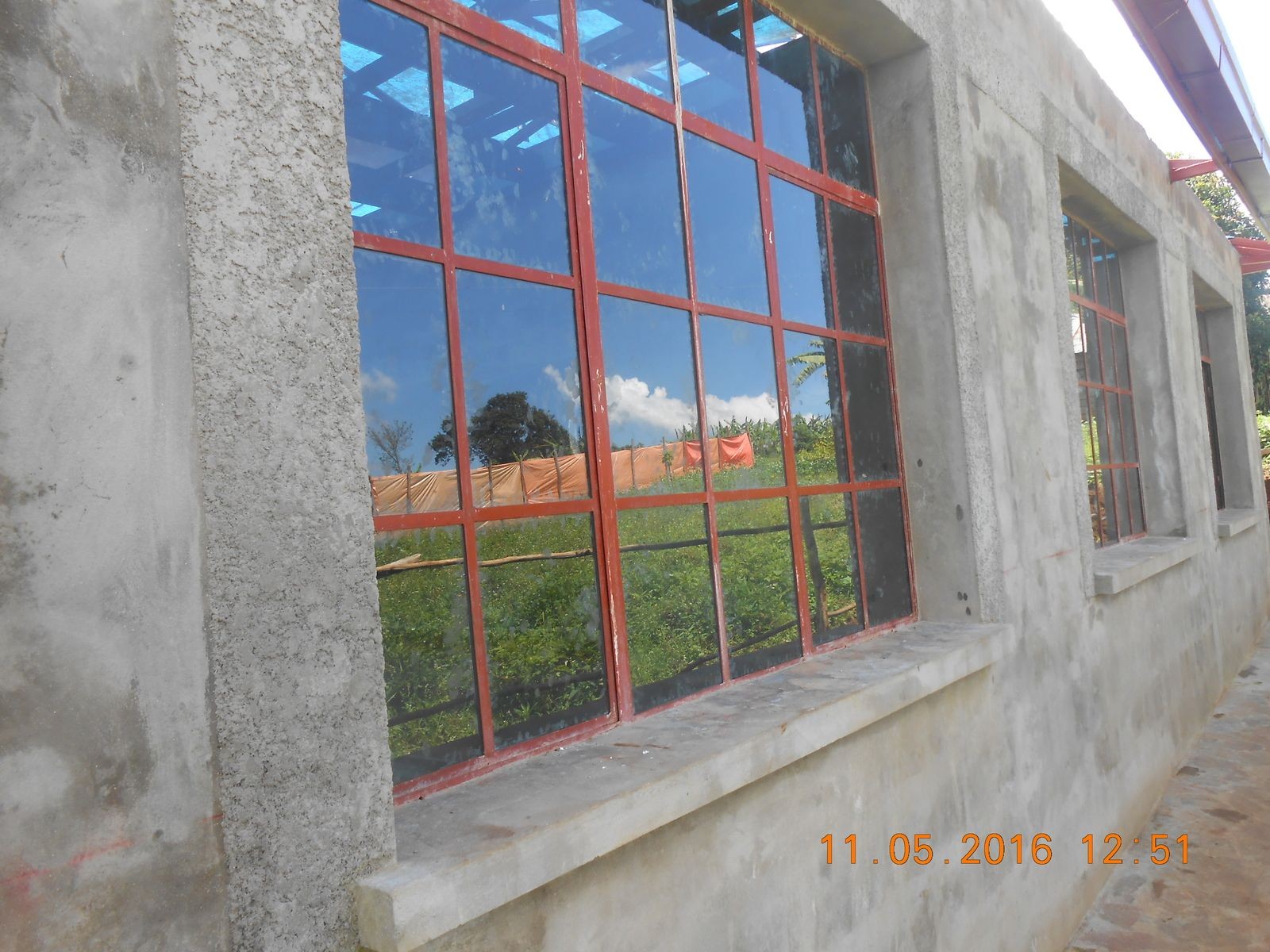 Im Mai werden die Fenster und Türen verglast, das Dach und die Dachrinnen lackiert sowie die Dämmplatten an der Kassettenkonstruktion angebracht. Der Lärm einer Klasse mit 55 Kindern und das Geräusch eines heftigen Regens auf dem Dach sollen damit gedämpft werden. Die Außen- und Innenwände sowie die Decken werden mehrfach gestrichen. In jedem Klassenzimmer gibt es nun eine mehrere Meter große, fest angebrachte Tafel.