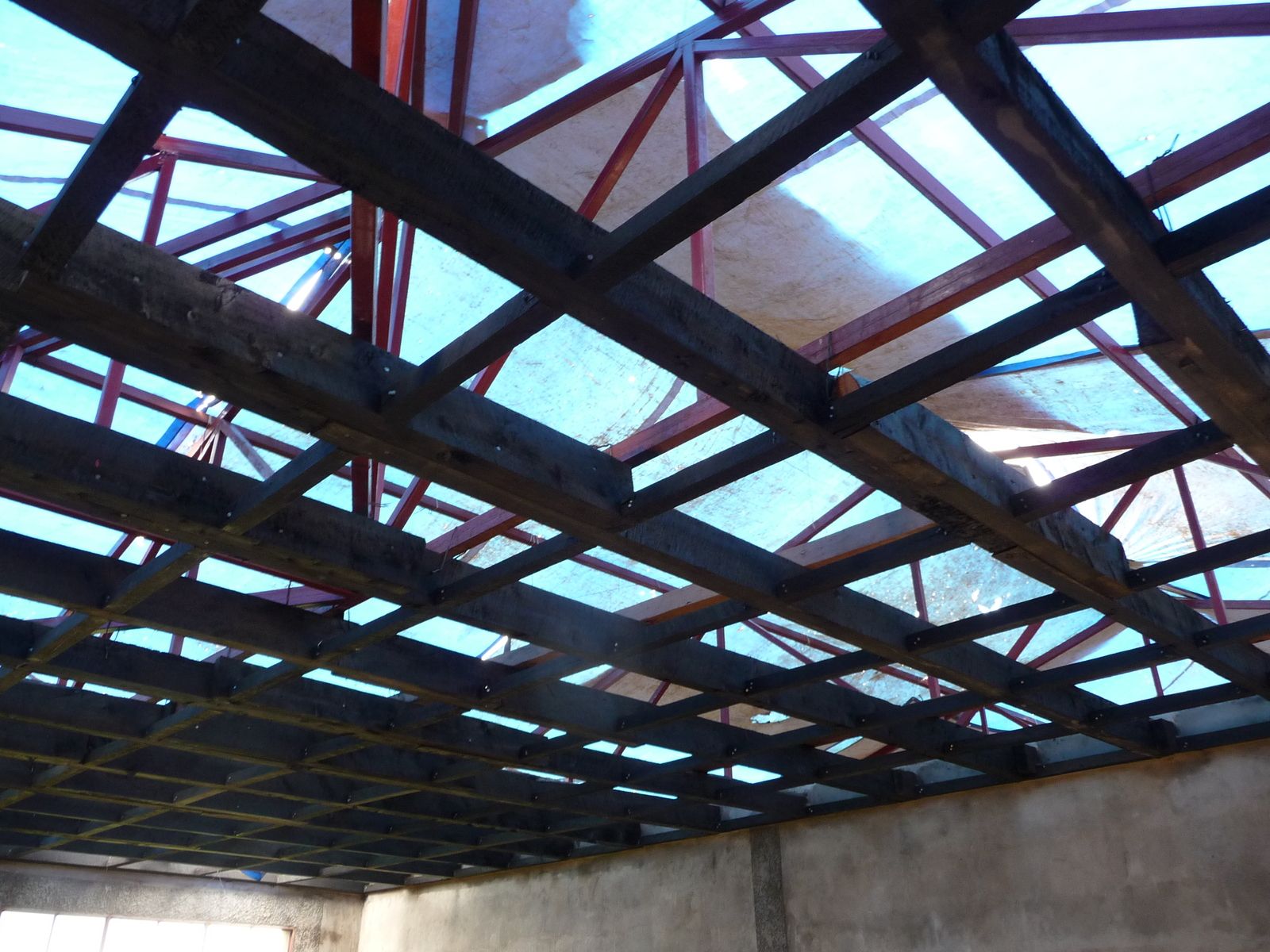 Anfang März 2016 sind die Wände auch außen verputzt. Die Tragkonstruktion des Leichtdaches aus Metall ist geliefert und auf dem Rohbau angebracht. Die Maurer verlegen Steinplatten auf dem Boden unter dem Vordach. Auch die Fensterbänke werden mit diesen Steinplatten gestaltet. Alle Fensterrahmen werden eingebaut.